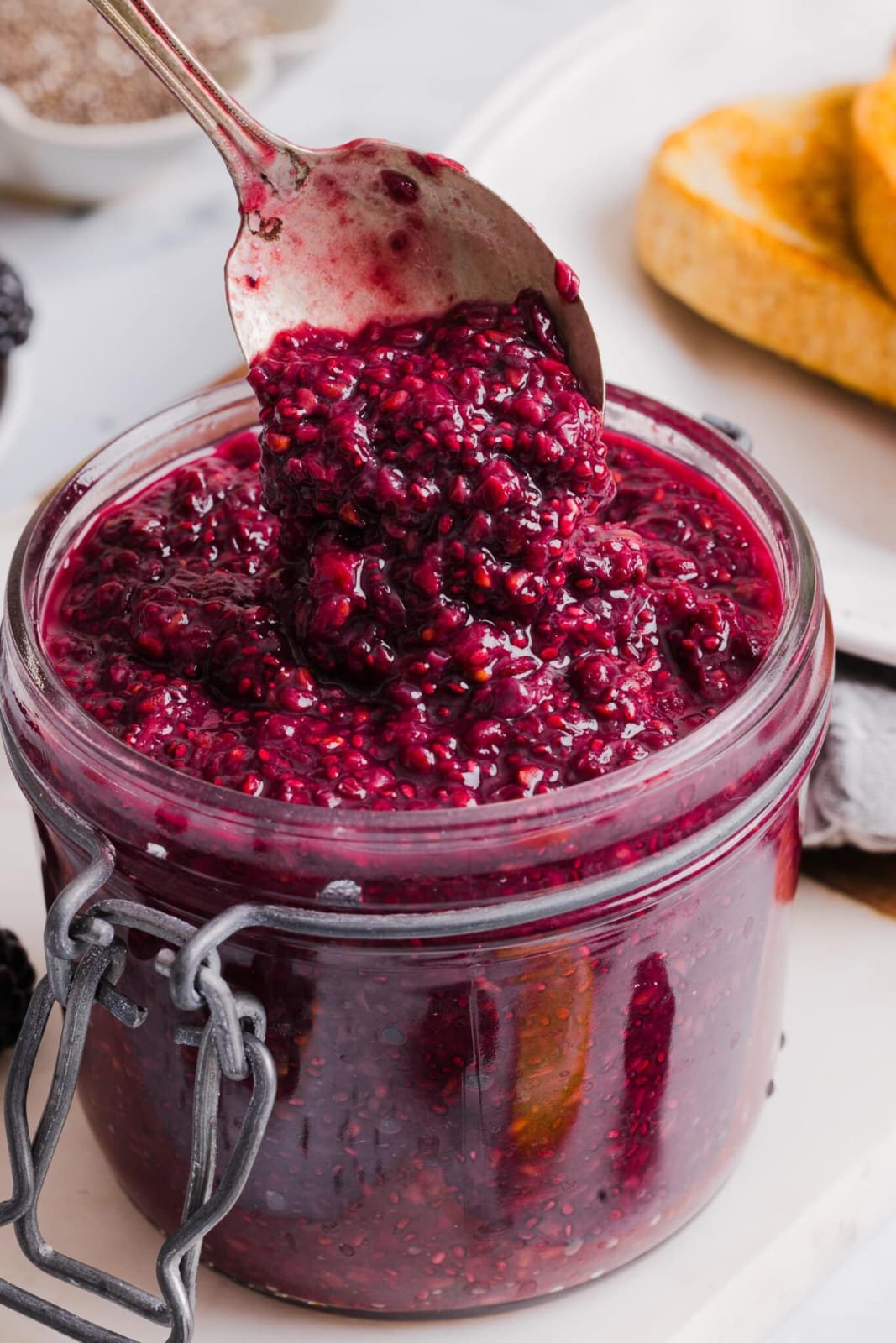This blackberry chia seed jam is special because it is both healthy and tasty. Unlike regular jam, it does not need refined sugar or artificial ingredients. This makes it a better choice for people who care about their health.