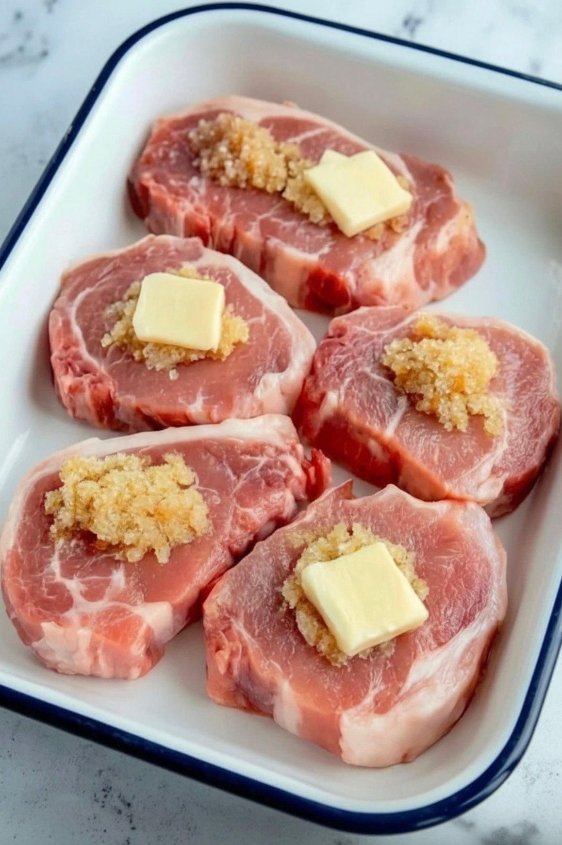 Now take a baking dish or tray and lightly grease it with a little olive oil. Place the seasoned pork chops in the dish in a single layer. Do not stack them on top of each other because they need space to cook properly. Once they are placed, add a small cube of butter on top of each pork chop. The butter will melt during cooking and mix with the brown sugar to create a tasty sauce.