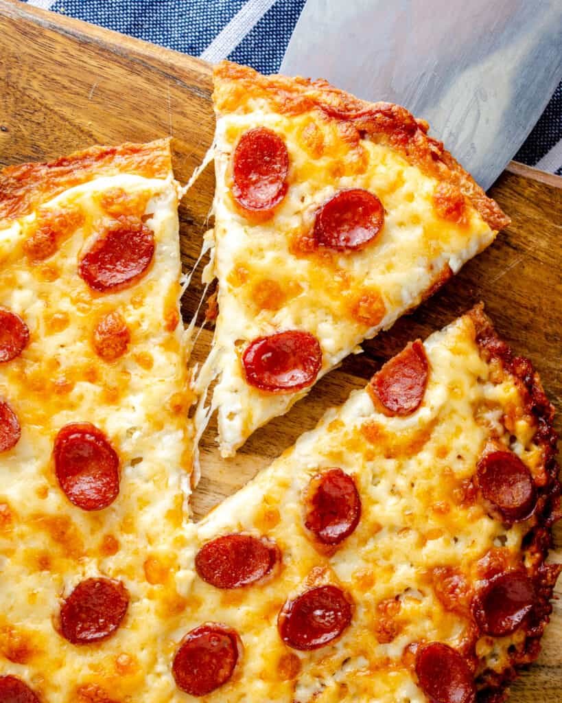 Pre-bake the chicken crust. Bake in a 450°F [230°C] for 10-12 minutes until the crust is firm and beginning to brown. If the crust feels too soft continue to bake.Sauce and add toppings. Remove the crust from the oven and spread a thin layer of softened cream cheese or your favourite low carb pizza sauce over the crust leaving a gap around the edge. Add grated mozzarella cheese and pepperoni or your preferred pizza toppings.4 tablespoons cream cheese,2 oz Pepperoni,⅓ cup mozzarella cheeseBake until cheese bubbles. Bake the pizza at 450°F [230°C] until the cheese melts, bubbles, and is just starting to brown. Remove and allow the pizza to cool slightly before slicing.