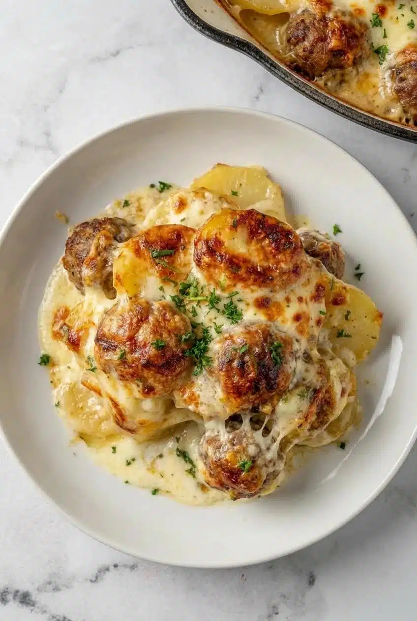 People love this recipe because it has everything in one dish. You get protein from the meatballs, carbohydrates from the potatoes, and a creamy texture from the melted cheese. The flavors blend together perfectly while baking, creating a rich and comforting taste. The cheese melts on top and becomes golden and slightly crispy, while the potatoes stay soft and tender. The meatballs soak up the sauce and become even more flavorful. This mix of textures and tastes makes every bite enjoyable and filling.