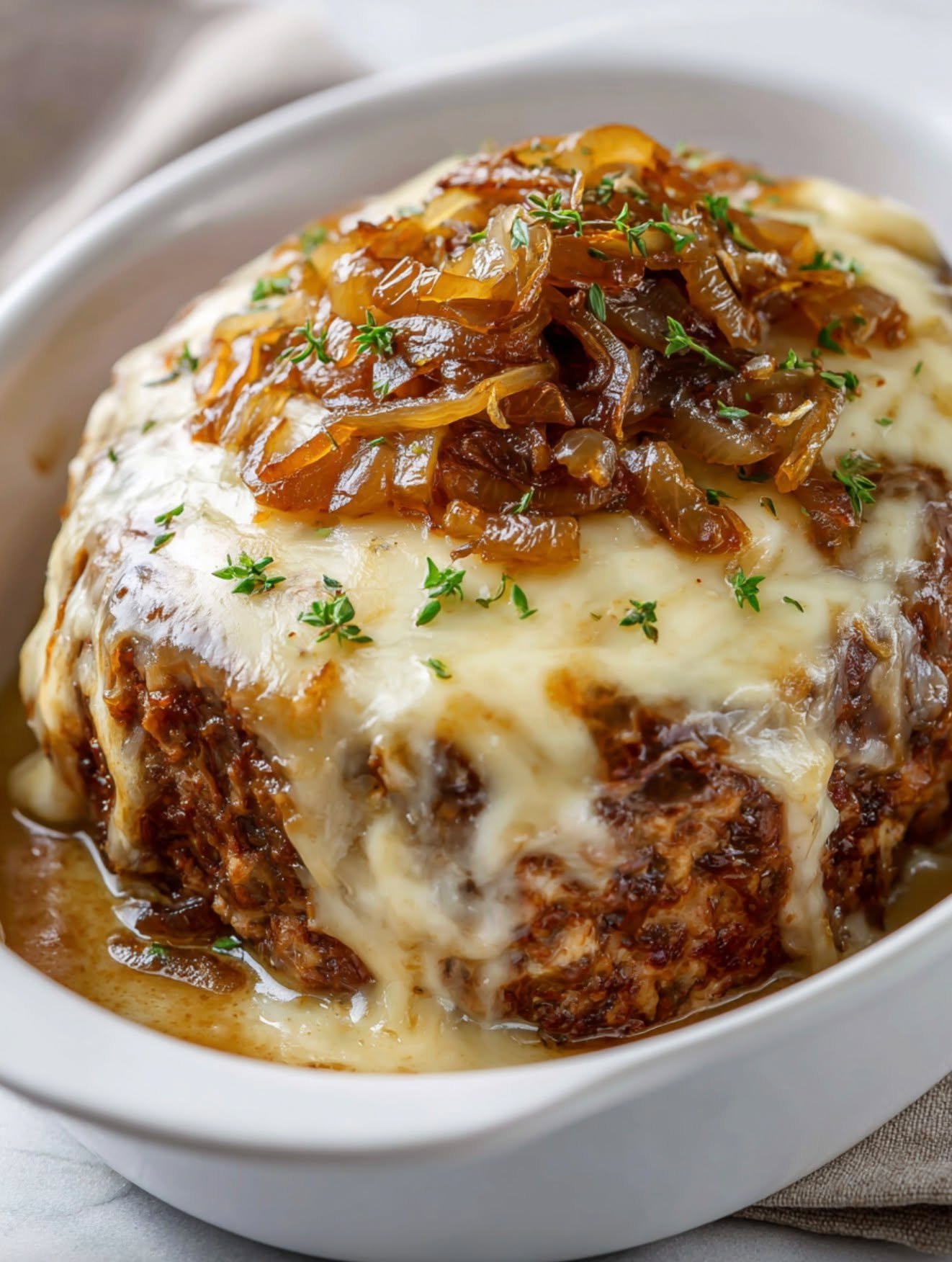 This recipe is special because it combines the classic taste of meatloaf with the rich flavor of French style onions. The slow cooking method makes the meat very tender and juicy.