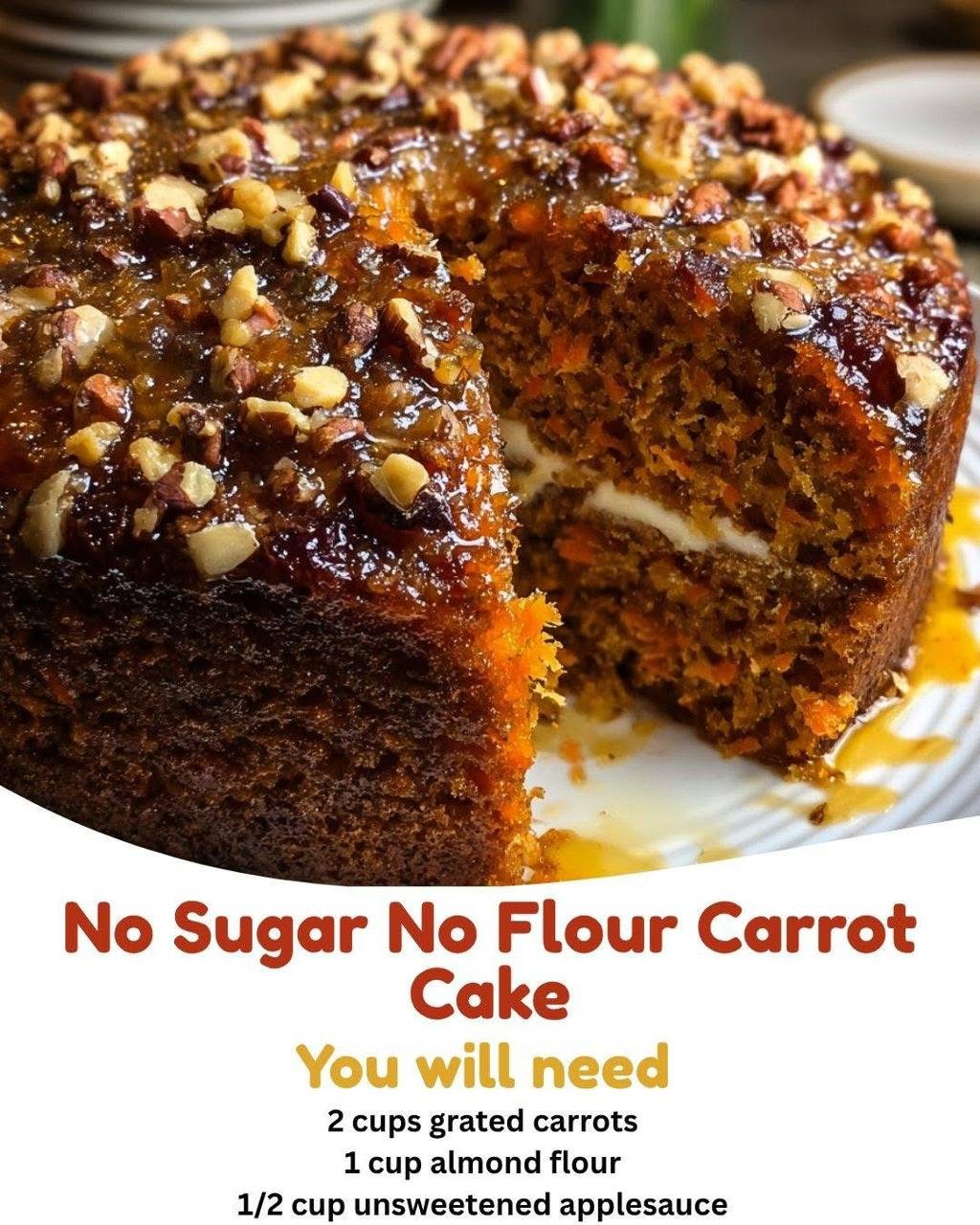 Carrot cake is one of those desserts that many people love, but it is often full of sugar and white flour. This version is different in a very special way. It is called no sugar no flour carrot cake, which means it is made using healthier and more natural ingredients. Instead of regular sugar, it uses natural sweetness from fruits or other alternatives. Instead of white flour, it uses ingredients like nuts or oats. This makes the cake lighter, more wholesome, and suitable for people who want to eat better without giving up desserts. It still looks rich and delicious, just like a classic carrot cake, but with a healthier twist that many people are now looking for in their daily meals.