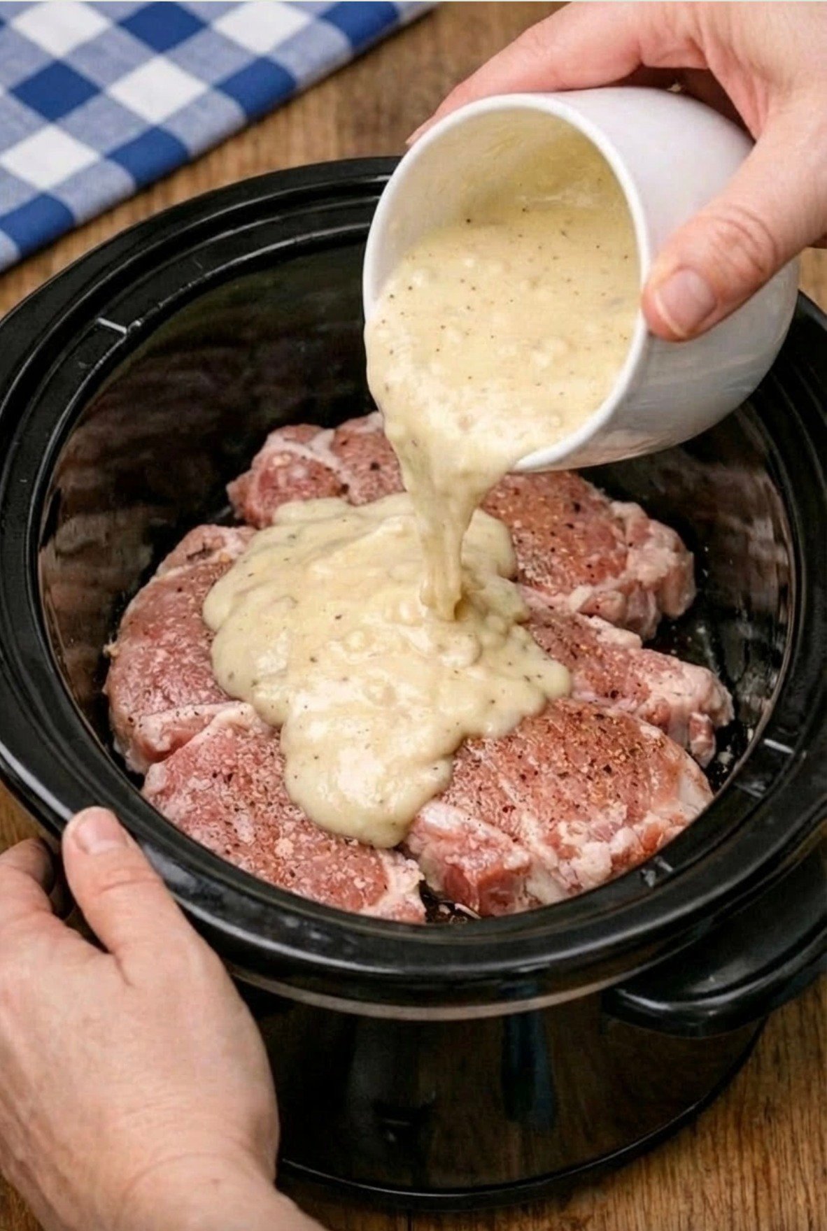 Place the pork chops at the bottom of the slow cooker. Try to arrange them in a single layer so they cook evenly. If they overlap a little, that is okay, but try to keep them as flat as possible.